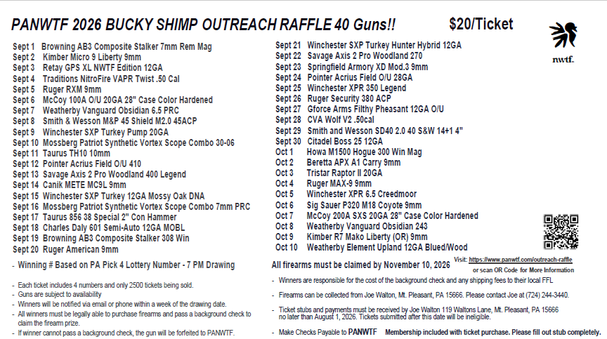 - All winners must be legally able to purchase firearms and pass a background check to claim the firearm prize.
